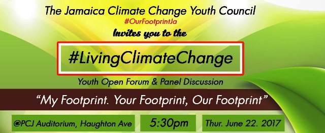 On June 22, 2017, the Jamaica Climate Change Advisory Board in introducing the Jamaica Climate Change Youth Council will present a “Self Awareness” Forum and Panel Discussion Titling; “Living Climate Change: My Footprint, Your Footprint, Our Footprint” . This event will take place at the Petroleum Corporation of Jamaica (PCJ) Auditorium, on Haughton Avenue in Kingston, to commence at 5:30pm.